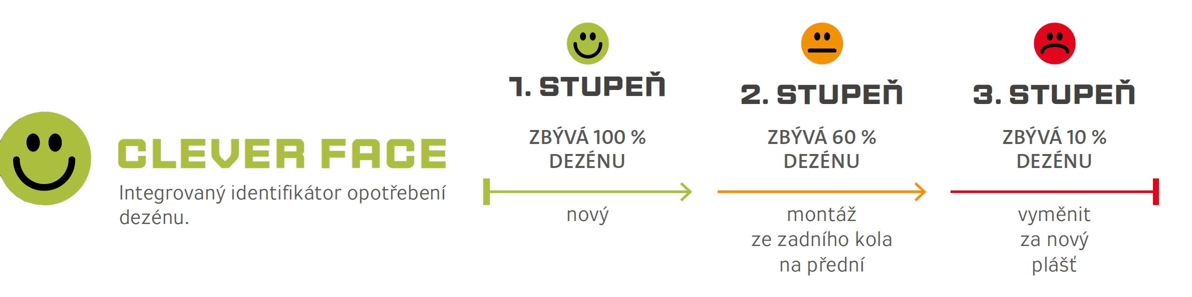Dezén je opatřen integrovaným identifikátorem opotřebení (Clever Face), který pomocí výrazu tvaru úst „smajlíka“ upozorňuje cyklistu na míru opotřebení dezénu.